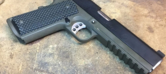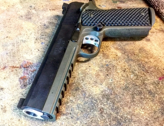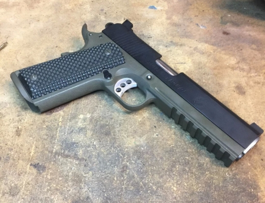 Springfield mil spec with a full rail. I cut it for some Trijicon HD sights, hand textured the front strap and mainspring housing, fitted a Wilson beaver tail, Cylinder and slide internals, recessed the take down pin, cut a crown flush on the barrel, then finished it with a two tone teracoat.